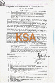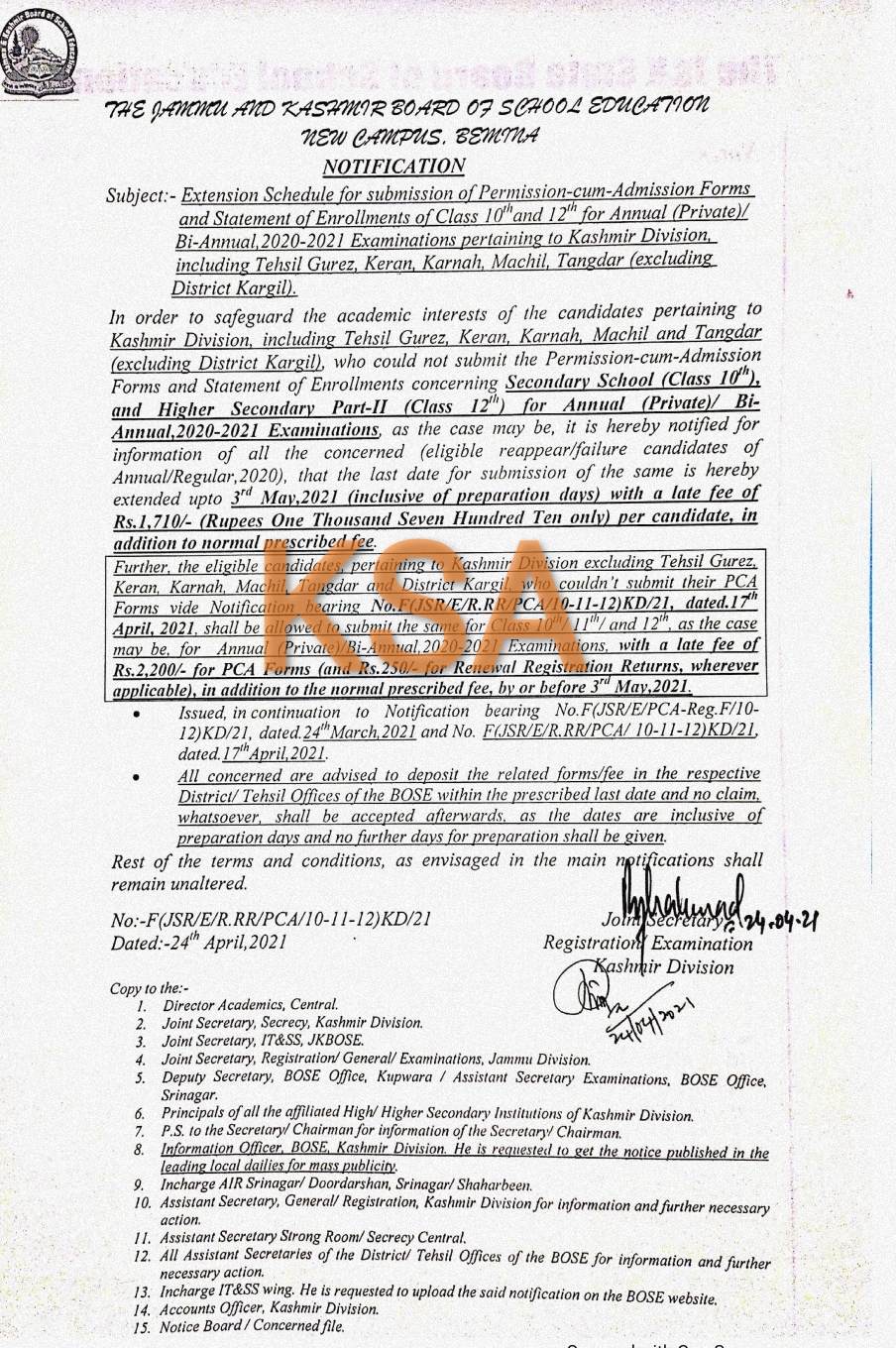 Subject:- Extension Schedule for submission of Permission-cum-Admission Forms and Statement of Enrollments of Class 10th and 12th for Annual (Private)! Bi-Annual, 2020-2021 Examinations pertaining to Kashmir Division including Tehsil Gurez, Keran, Karnah, Machil, Tangdar (excluding District Kargil