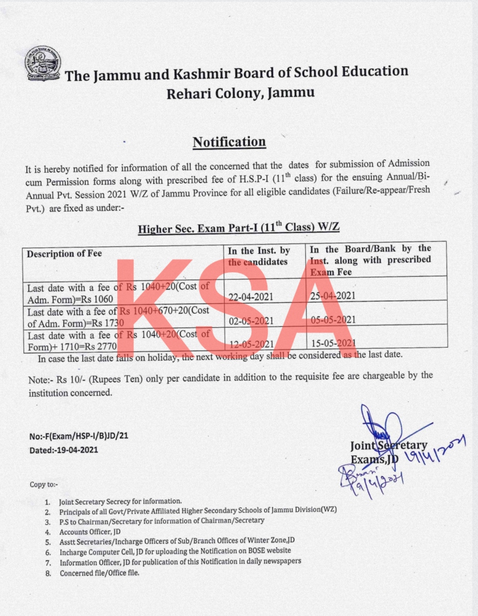 Notification for submission of Admission-cum-permission forms for HSP-I(class 11th) for ensuing Annual / Bi-Annual Session 2021 W/Z areas of jammu province for all eligible candidates (Failure/Re-appear/Fresh Pvt.)