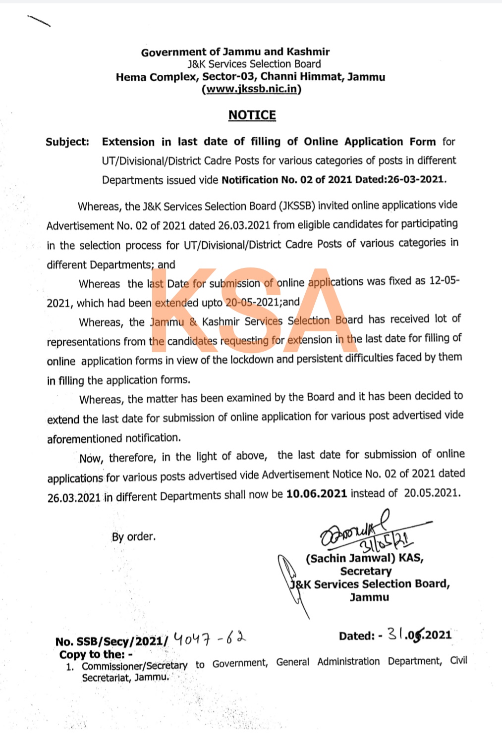 Extension of last Date of filling of Online Application Form for UT/Divisional/District Cadre Posts for various categories of posts in different Departments issue vide Notification No 02 of 2021 dated 26-03-2021.