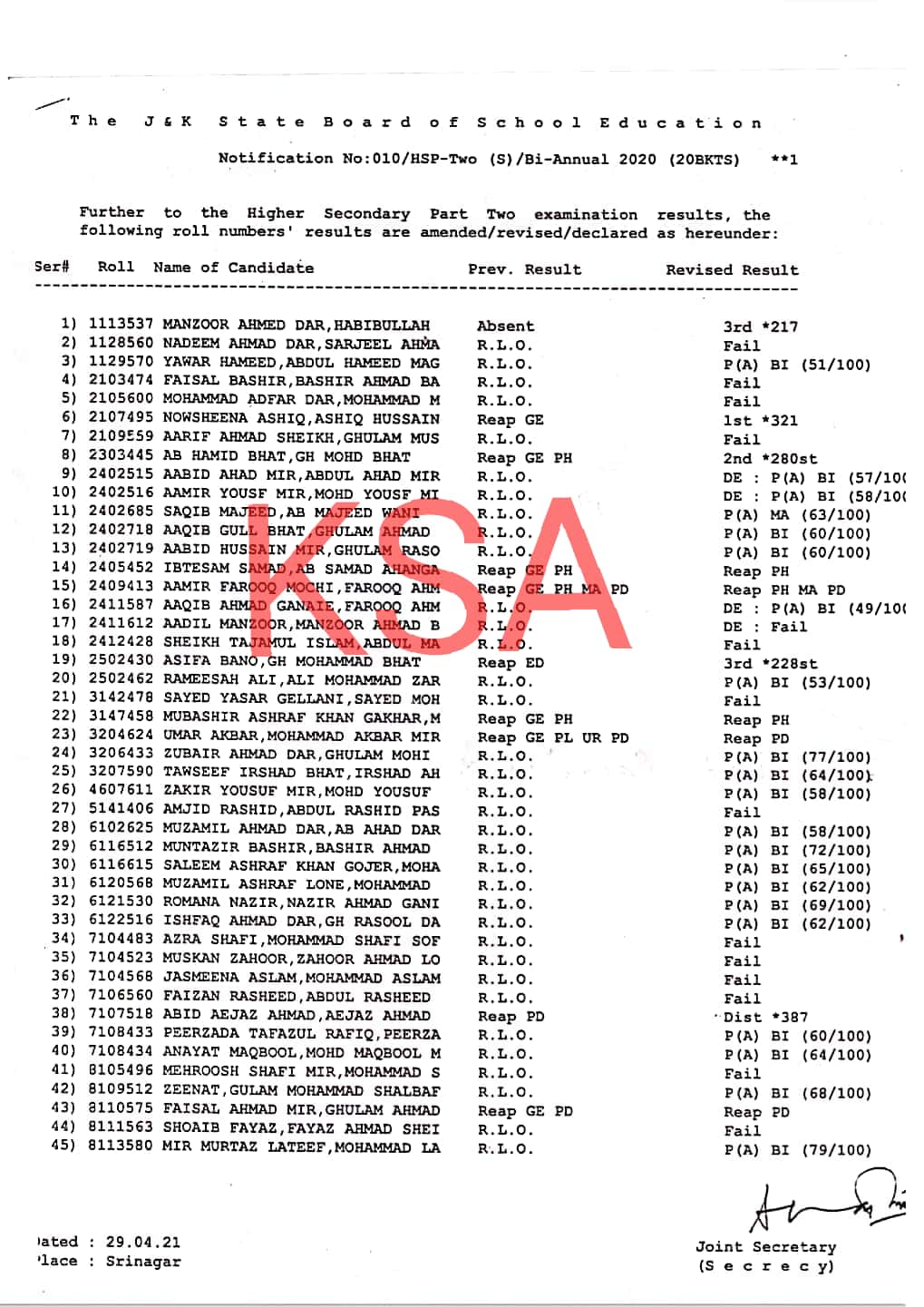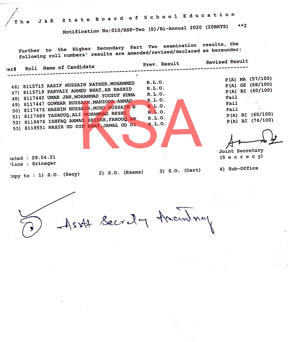Further to the Higher Secondary Part Two examination results, the