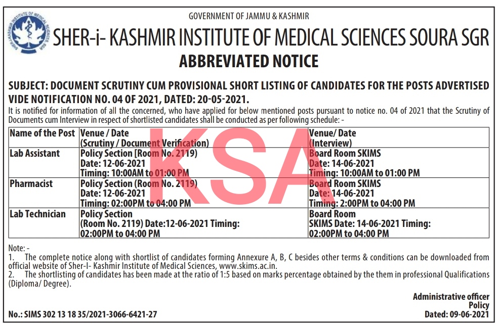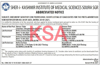 DOCUMENT SCRUTINY CUM PROVISIONAL SHORT LISTING OF CANDIDATES FOR THE POSTS ADVERTISED VIDE NOTIFICATION NO. 04 OF 2021, DATED: 20-05-2021.
